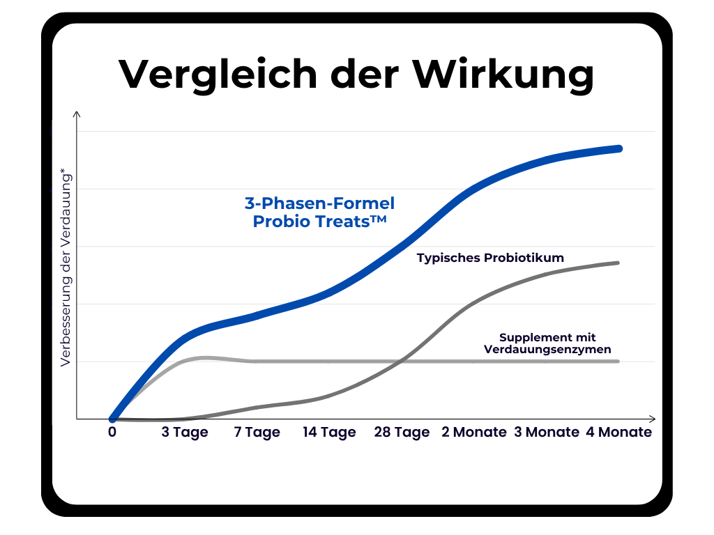 Probio Treats wirken umfassend durch die 3-Phasen-Formel, die Verdauungsenzyme, Probiotika, Präbiotika und Postbiotika kombiniert.