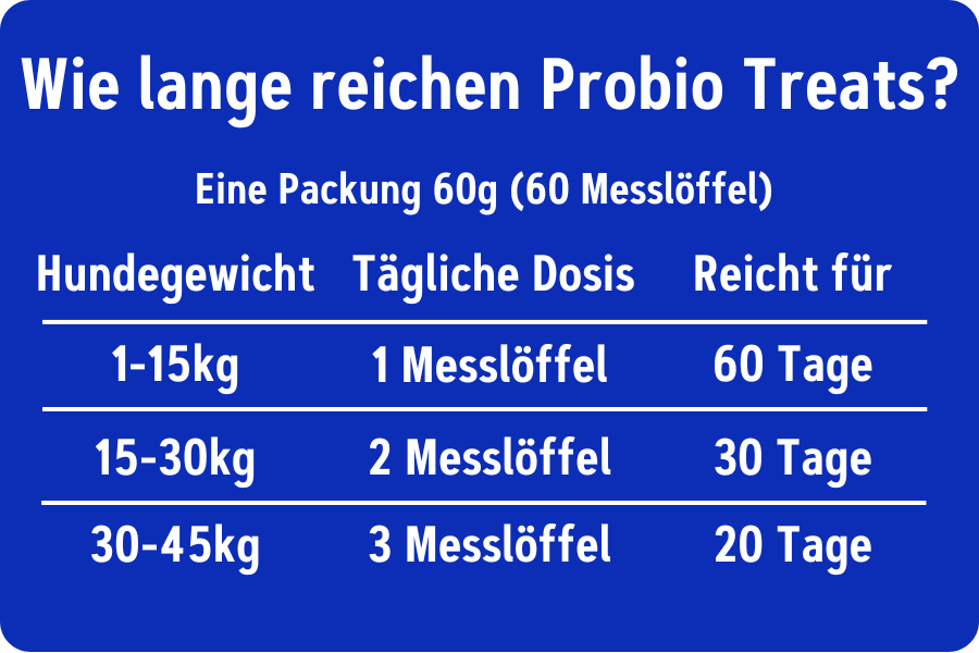 Oben in der Beschreibung finden Sie eine detaillierte Dosierungstabelle, die Ihnen hilft, die richtige Menge für Ihren Hund präzise zu bestimmen.