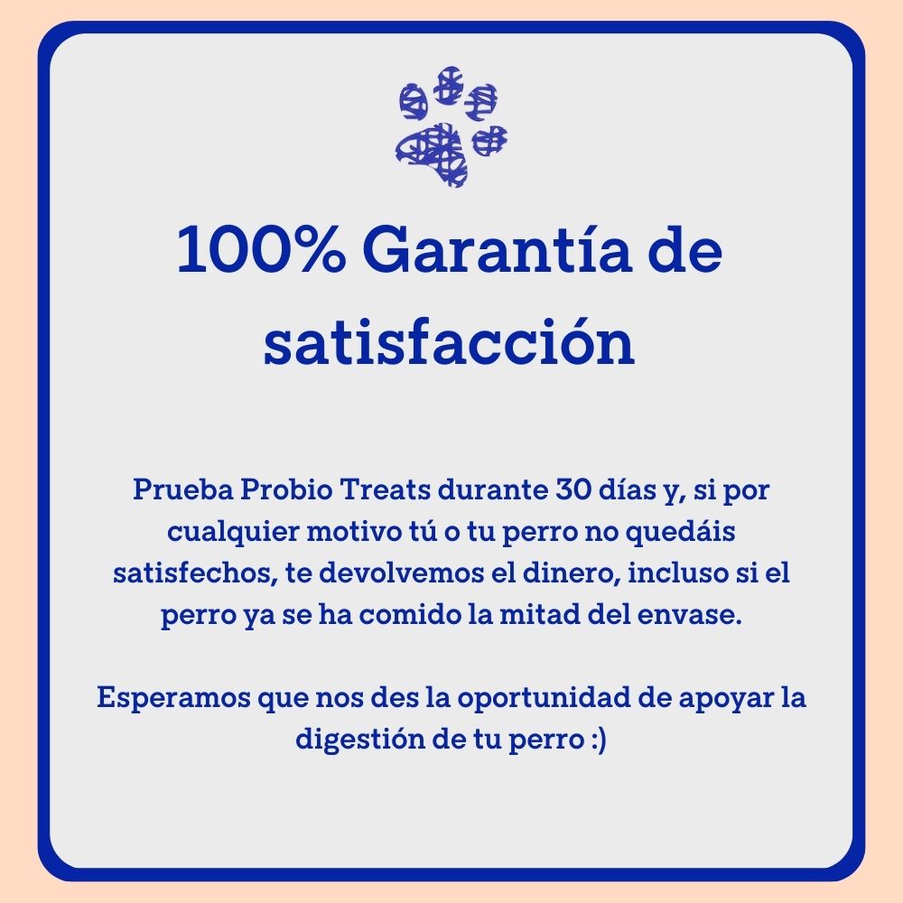 Prueba Probio Treats durante 30 días y, si por cualquier motivo tú o tu perro no quedáis satisfechos, te devolvemos el dinero, incluso si tu perro ya se ha comido la mitad del envase.