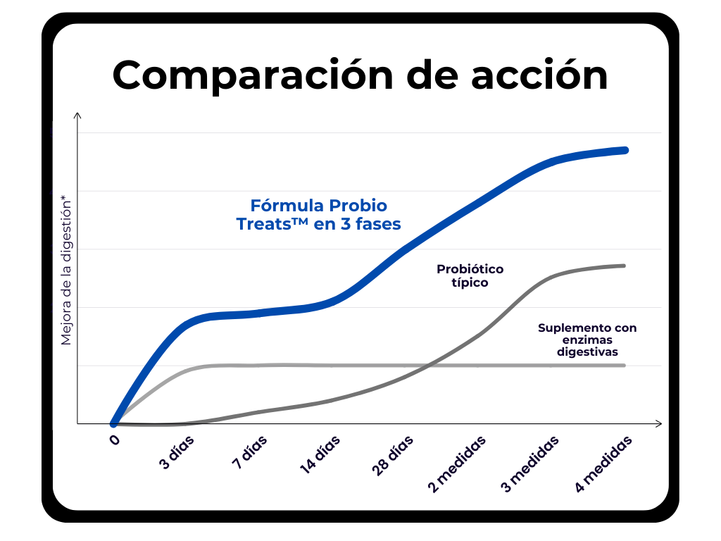 A diferencia de la mayoría de los probióticos, que se centran en un solo aspecto, Probio Treats utiliza una fórmula propia que, como única, ofrece una acción en 3 fases: prebiótico, probiótico y postbiótico, con el añadido de enzimas digestivas en un solo producto.