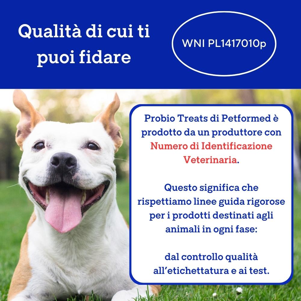 In Petformed mettiamo al primo posto la sicurezza del tuo cane. Sappiamo che la salute del tuo animale è fondamentale: per questo Probio Treats è prodotto nell’Unione Europea secondo i più alti standard di qualità e sicurezza.