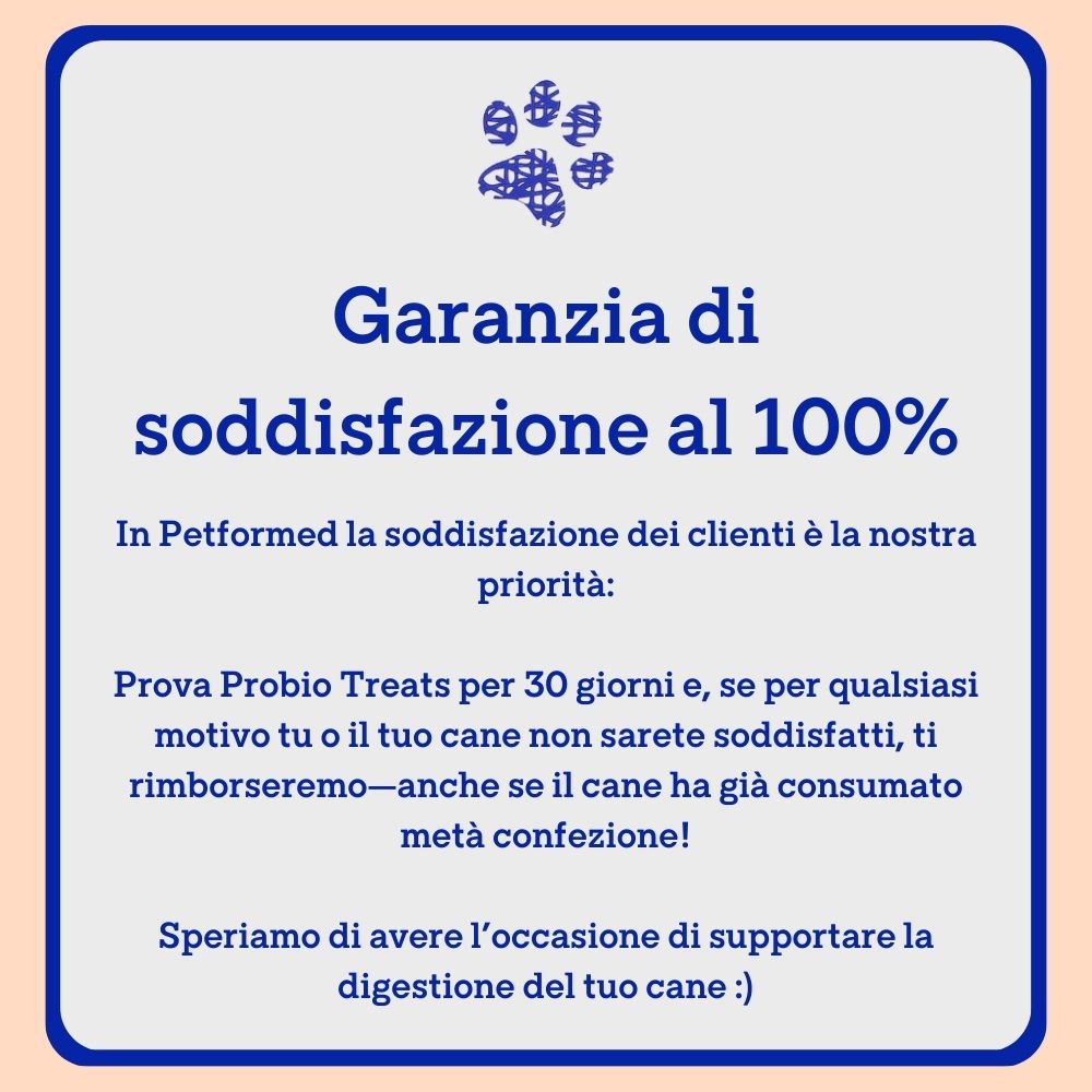 Inoltre offriamo una garanzia di soddisfazione al 100%: se entro 30 giorni qualcosa non ti convince, puoi restituire il prodotto e ricevere il rimborso—anche se il cane ha già consumato metà confezione.