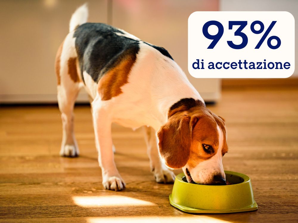 Abbiamo svolto test su cibo umido a cui i cani erano già abituati: in 4 settimane l’accettazione è stata del 93%.