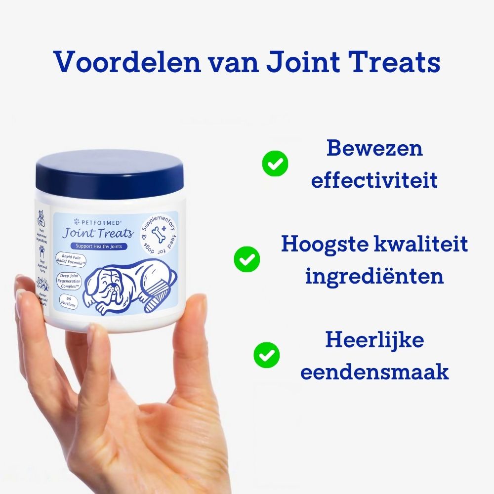 Joint Treats is een premium supplement voor de gewrichtsgezondheid voor honden, ontworpen met een unieke tweefasige formule voor snelle en blijvende ondersteuning.