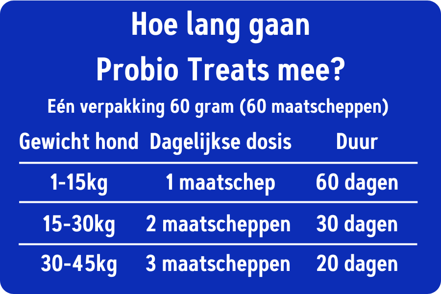 Dat is niet nodig. Probio Treats bevatten natuurlijke ingrediënten die darmen en immuniteit continu ondersteunen, zonder risico van overbelasting van het organisme.