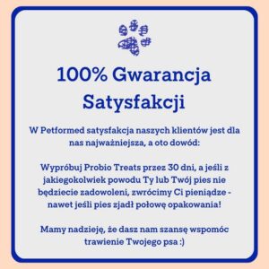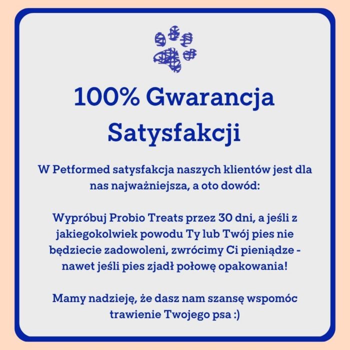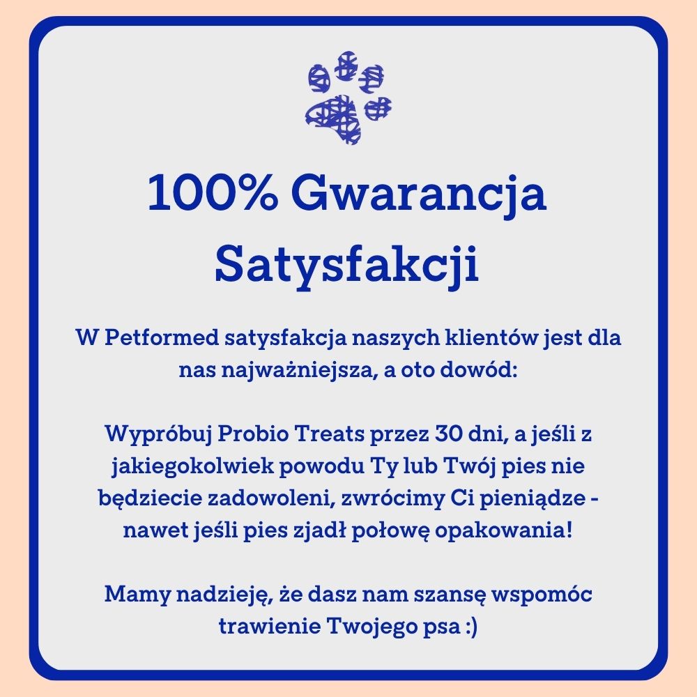 Oferujemy 30-dniowy okres próbny. Oznacza to, że po zakupie masz 30 dni na zwrot produktu bez podawania przyczyny, nawet jeśli Twój pies zjadł połowę przysmaków w paczce!