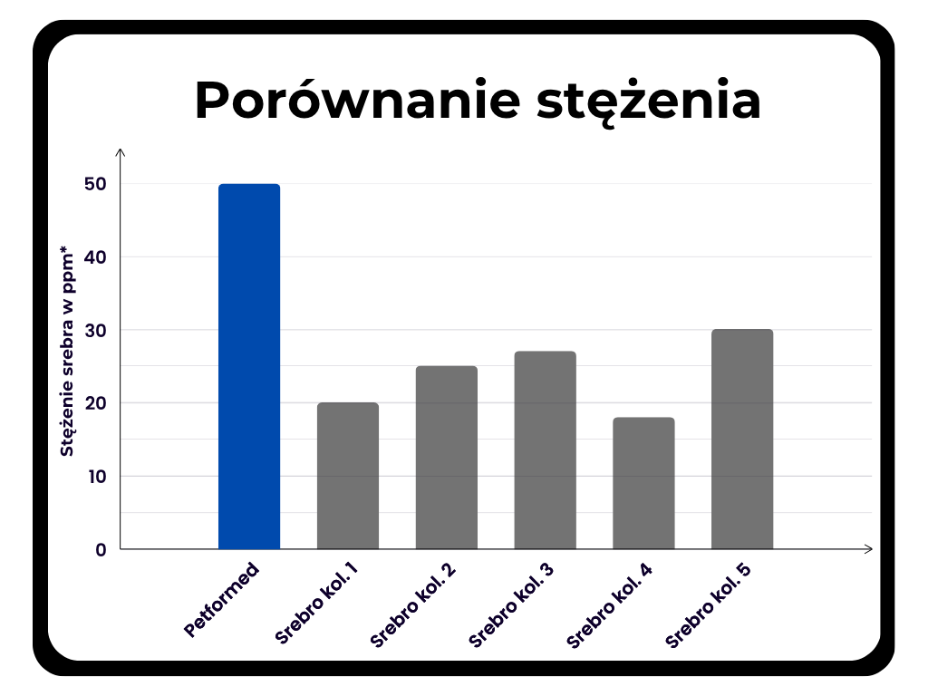 W przeciwieństwie do większości produktów dostępnych na rynku, srebro koloidalne Petformed zawiera stężenie 50ppm czystego nanosrebra - jedno z najwyższych stężeń dostępnych w Polsce.