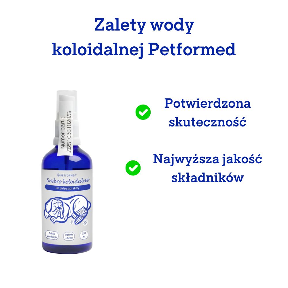 Srebro koloidalne Petformed to innowacyjny, niejonowy roztwór nanosrebra o wysokim stężeniu 50ppm, przeznaczony do pielęgnacji skóry psów.