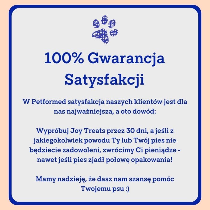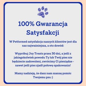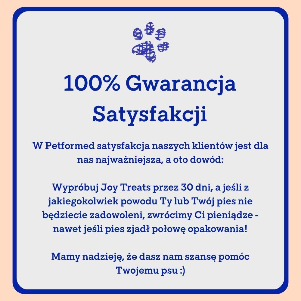 Oferujemy 30-dniowy okres próbny. Oznacza to, że po zakupie masz 30 dni na zwrot produktu bez podawania przyczyny, nawet jeśli Twój pies zjadł połowę przysmaków w paczce!