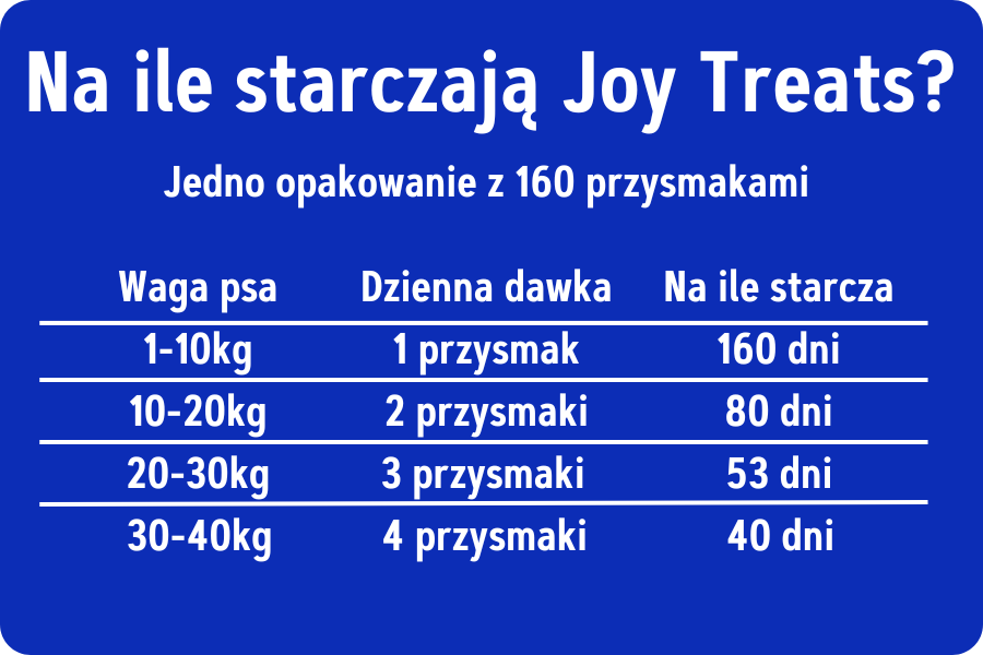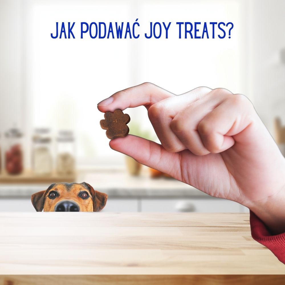 Wystarczy podać psu odpowiednią liczbę przysmaków dziennie. Psy traktują Joy Treats jak nagrodę i chętnie je jedzą.