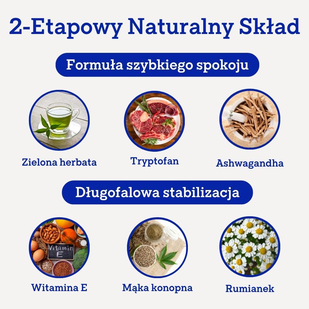 Formuła szybkiego spokoju: natychmiast uspokaja dzięki L-teaninie i tryptofanowi, które zwiększają poziom serotoniny i GABA w mózgu już po 30-60 minutach.