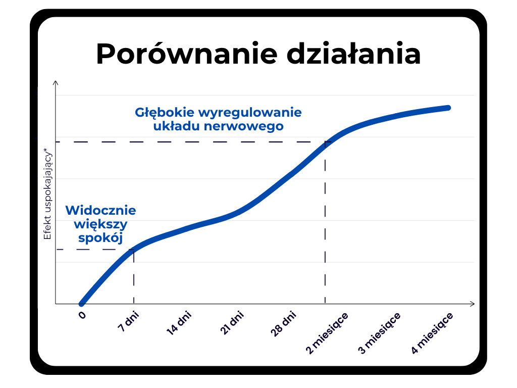 • Pierwsze 1–2 dni: zauważalne uspokojenie i mniejsze reakcje na stres