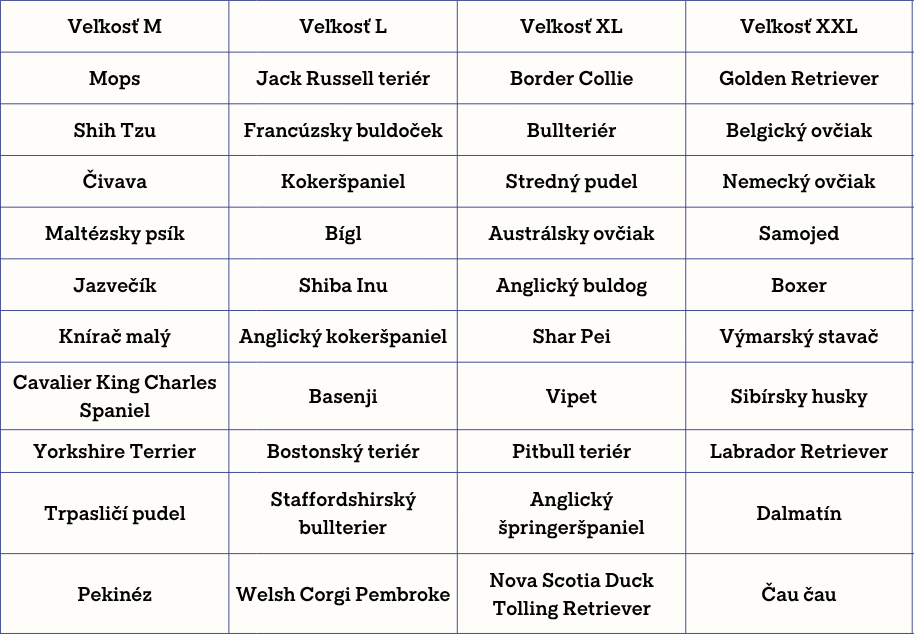 Stačí pozrieť do tabuľky a nájsť plemeno svojho psa.